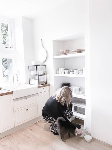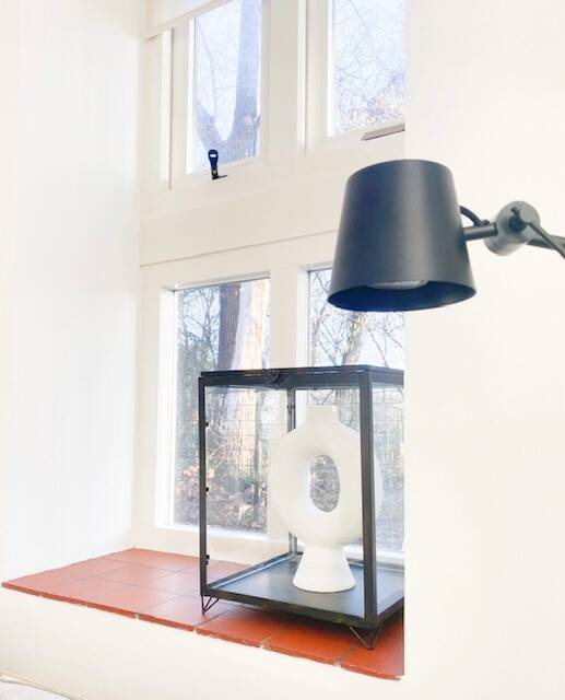 De basis van het huis was heel basic en dat vonden wij beiden mooi. De benedenverdieping is in een U- vorm gebouwd om de gesloten hal en hierdoor kijken we zo vanuit de woonkamer zowel de keuken als het kantoor in. Dat is gezellig maar je ziet heel veel. Om deze redenen wilden we het voor de rest heel rustig houden. We hebben daarom gekozen voor veel wit. Dit brengt rust en maakt alle ruimten lichter. Niet voor niets kiezen veel mensen voor wit. Maar eerlijk gezegd vind ik dat sommigen daarin doorschieten. De vraag is of man- lief en kids daar wel daar wel zo blij van worden..... Daarbij is het ook niet praktisch; een huis is om in te leven en niet om door geleefd te worden omdat alles zo snel vies wordt en dagelijks gepoetst of gewassen moet worden. Ik kies daarom ook voor warme tinten zoals ecru. Ook heb ik contrast aangebracht door middel van elementen die van oudsher ook zwart waren zoals de kachel, de lichtknoppen en de stopcontacten; een knipoog naar de oude tijd!