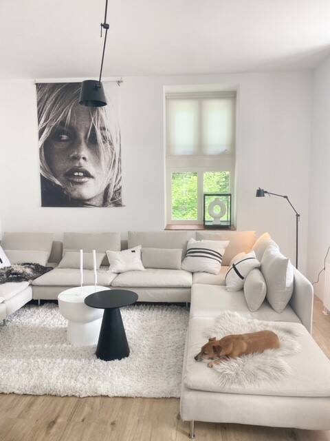 Zo ben ik gek op op het grote doek van Brigitte Bardot (marktplaatsvondst) en onze nieuwe bank van de Soderhamn serie van Ikea. Ideaal met de hoezen die je kunt wassen of vervangen wanneer je van tint wilt veranderen. Maar ik gun ons ook soms echt designitems zoals de strakke kruk van Stool Angle of kandelaren van kwilleminhuis.